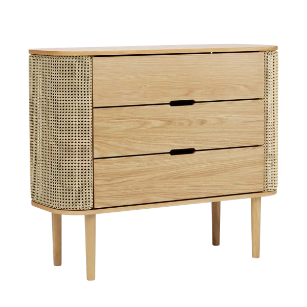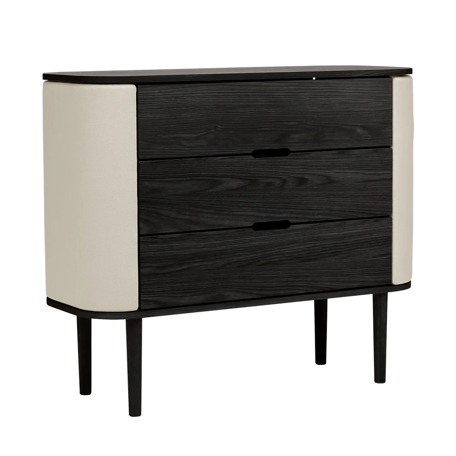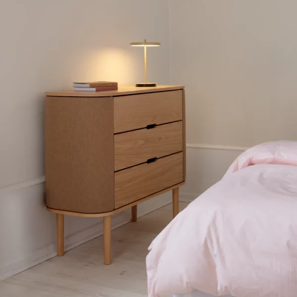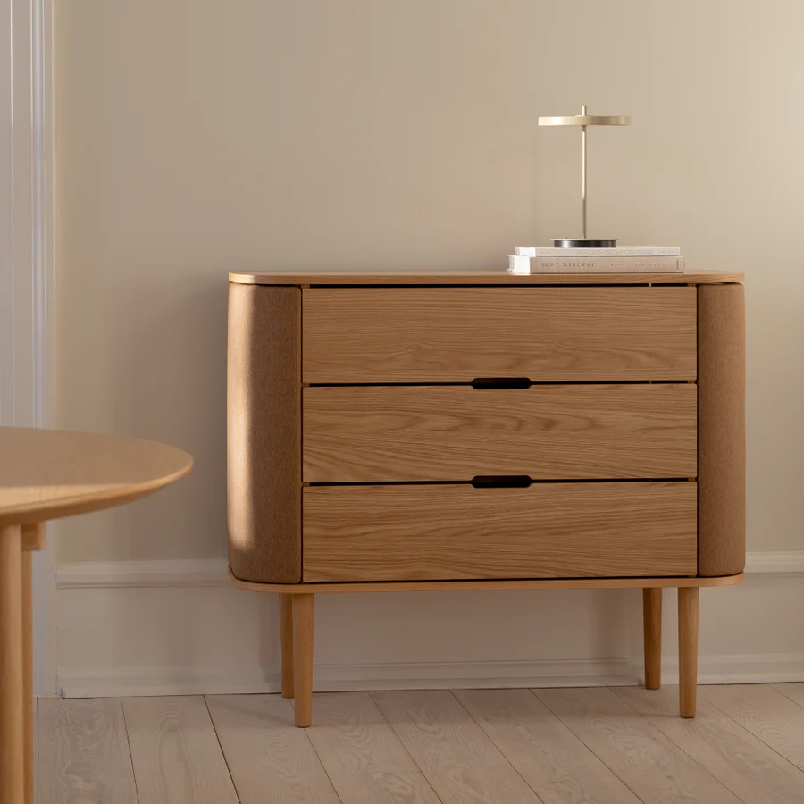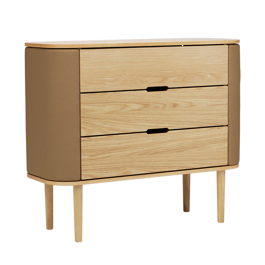 La commode Treasures de Umage allie un design scandinave minimaliste à des détails délicats et chaleureux. Ses lignes douces et sa structure en bois évoquent une esthétique naturelle et intemporelle, tandis que ses portes courbes en tissu ajoutent une touche de légèreté et d’originalité.