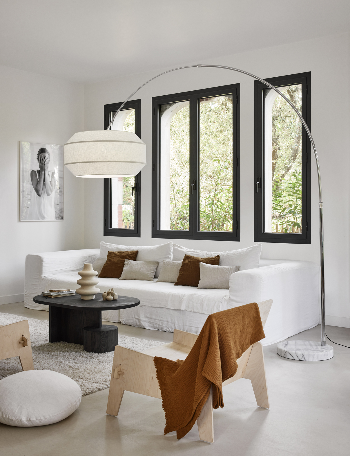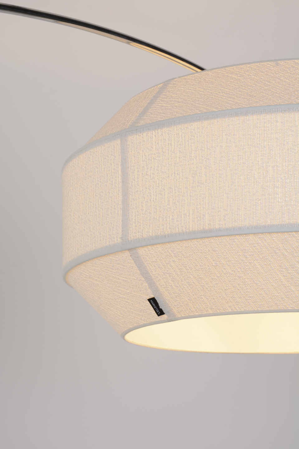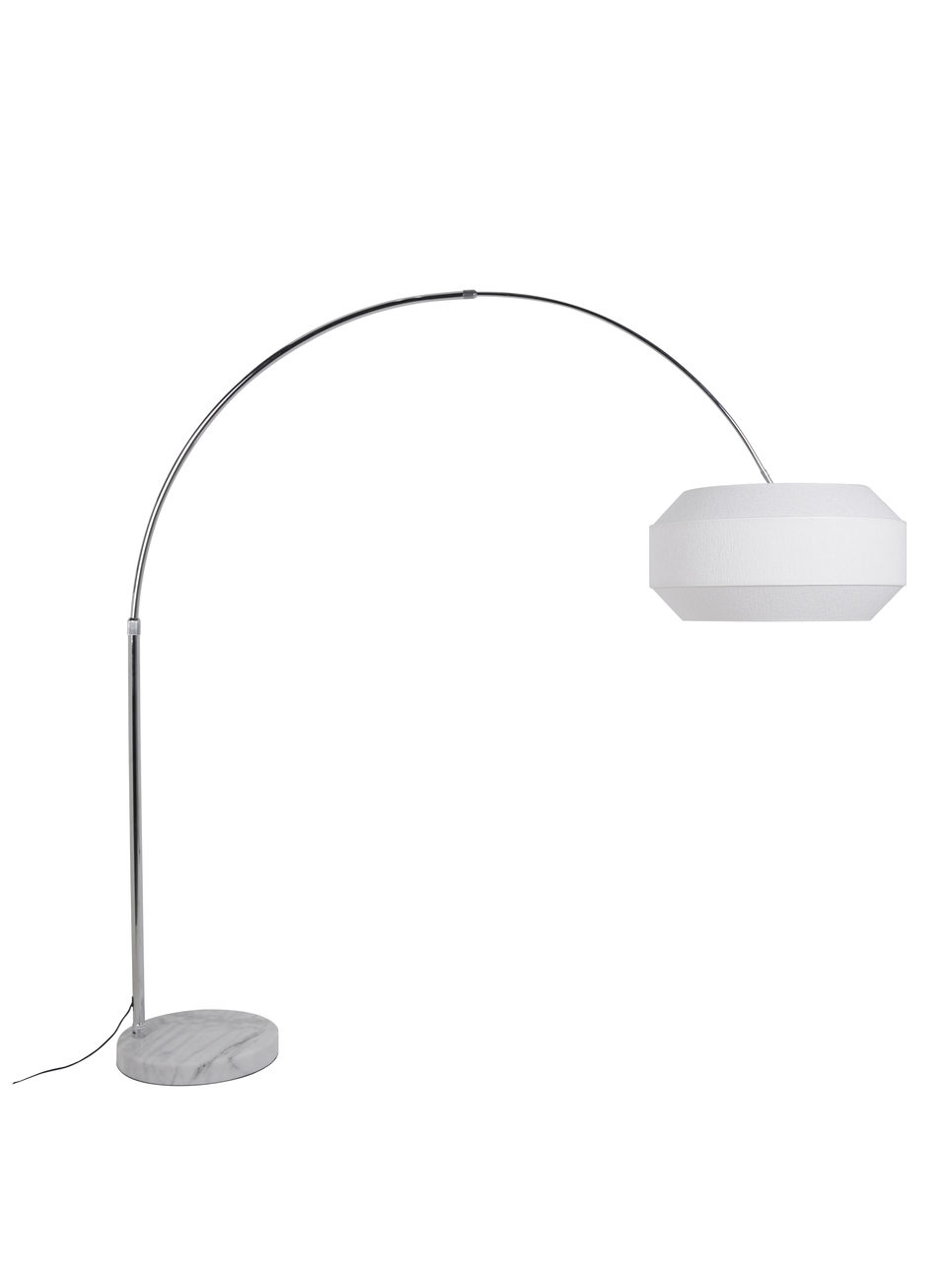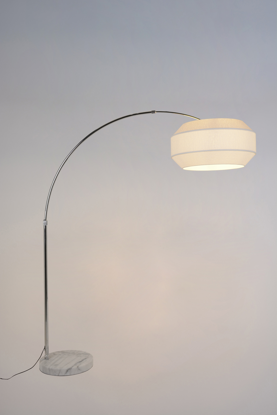 Lampadaire déporté base ronde en marbre et tige en métal chromé. Abat-jour en tissu bouclette. Réglable en hauteur. Interrupteur au pied.