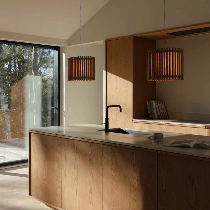 La suspension Komorebi de Umage s’inspire du jeu de lumière filtré à travers les feuillages – un concept japonais poétique incarné dans un design apaisant et organique. Sa combinaison de tissu doux et de bois sculpté diffuse une lumière chaleureuse, tout en créant une ambiance calme et enveloppante.